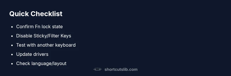 When a keyboard seems to only perform shortcuts, the problem commonly manifests as letters not appearing in text fields while shortcuts like Ctrl+C or Cmd+C still work. This is disruptive across everyday tasks, from writing emails to coding. According to Shortcuts Lib, many of these issues stem from simple, reversible settings rather than a dead key matrix. In most cases you can recover normal typing without swapping hardware. The impact is often mild at first—test in a text editor, a browser form, and a password field to confirm the exact scope of the problem. If the issue only happens in one application, the culprit is likely software-specific; if it happens everywhere, concentrate on system-wide settings and drivers. From a user perspective, a structured approach saves time and reduces stress when you face an urgent keyboard problem.