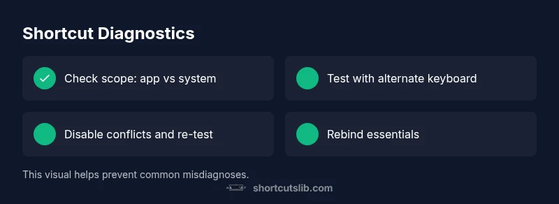 Keyboard shortcuts are designed to speed up tasks, but they rely on software accepting the input as a command. When a shortcut stops working, it's usually not a single hardware issue; it's an interaction problem between your keyboard, the operating system, and the active application. According to Shortcuts Lib, most keyboard shortcut problems fall into a few patterns: conflicts with global hotkeys, changes to keyboard layout, and app-specific overrides. Recognizing which pattern you're in will guide you toward the right fix quickly. Start by confirming whether the issue is universal across all apps or isolated to one program. If universal, system settings or a hardware fault is likelier. If isolated, the problem likely lies with that app's shortcut mapping or a conflicting extension. In either case, a methodical approach saves time and reduces frustration.
