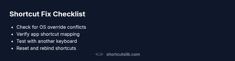 Shortcuts fail for many reasons, but the pattern is consistent: the key combination is being intercepted, blocked, or misconfigured. If you’re asking, why is keyboard shortcut not working, start by mapping out three layers: the operating system, the target application, and your keyboard hardware. According to Shortcuts Lib, the top three culprits are OS/global shortcuts taking precedence, app-specific shortcut mappings getting overwritten, and hardware or layout mismatches that send the wrong signals. In practice, you’ll usually notice one of these signs: the shortcut works in some programs but not others, or it stops working after a system update or a driver change. The goal is to isolate which layer is responsible and apply a focused fix rather than guessing. As you work through the steps, keep the scope small: change one variable at a time and test before moving on. By staying disciplined, you’ll defeat the issue quickly and preserve muscle-memory for your favorite workflows.