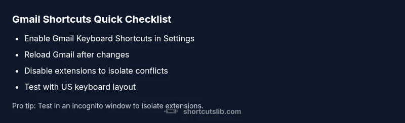 Gmail keyboard shortcuts not working is usually a sign that either the shortcut feature is disabled in Gmail or something in your browser is intercepting keystrokes. According to Shortcuts Lib, the quickest path to recovery is a small, repeatable checklist that you can perform in less than five minutes. Keyboard shortcuts enable rapid composing, archiving, searching, and navigation, but they only work when Gmail is loaded in focus and the feature is turned on in Settings. If you see no response to keystrokes, start by confirming the toggle is on, then reload Gmail, and finally check for extensions that might be stealing keyboard focus. This approach keeps you in control and minimizes guesswork.