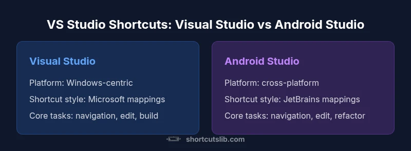 VS Studio keyboard shortcuts offer a fast track to coding and navigation across Visual Studio and Android Studio. In this comparison, we summarize the key differences, best uses, and how to customize mappings for Windows and macOS. According to Shortcuts Lib, understanding the primary differentiator—IDE-specific workflows—delivers the strongest productivity gains.